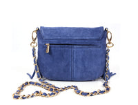 Make a bold yet elegant style statement with this suede fringe crossbody bag in a striking royal blue shade. Crafted from soft suede-finish material, it features a curved flap design accented with handcrafted fringe detailing for a chic boho-luxe look.
