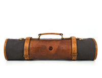 The Marchena Knife Roll in Grey is crafted from thick canvas with leather detailing. Designed to organize and protect your chef knives, it rolls up neatly and travels light.