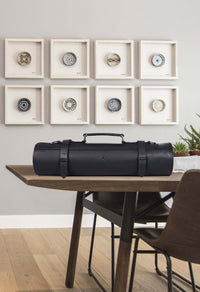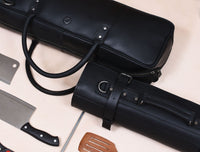 Crafted for culinary professionals, the Tuscania Knife Roll & Carry Bag in Raven Black is your all-in-one tool for secure travel and presentation. Handcrafted from premium Top Grain leather, it includes an 8-slot knife roll and matching shoulder bag. Designed for durability, mobility, and a bold statement in the kitchen.