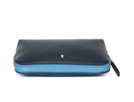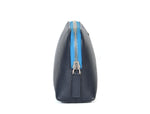 Crafted from premium pebble-grain leather, this navy blue pouch with bold blue zipper keeps essentials organized in style.